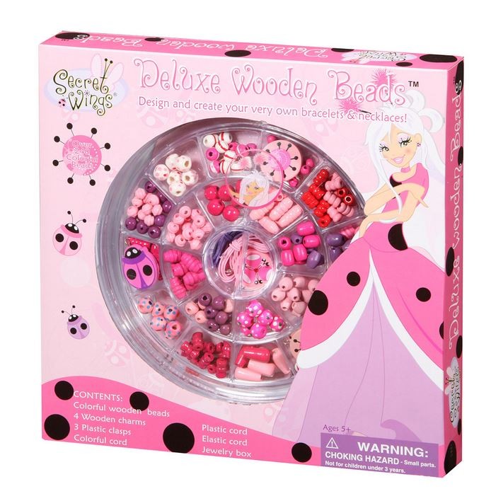 Deluxe Wooden Beads to olbrzymi zestaw kolorowych drewnianych koralików i ozdób wraz z akcesoriami w plastikowej szkatułce. Należy on do serii Secret Wings, która robi furorę wśród dzieci na całym świecie, z powodu postaci pięciu wróżek: Tansy, Poppy, Ivy, Honey i Lily.