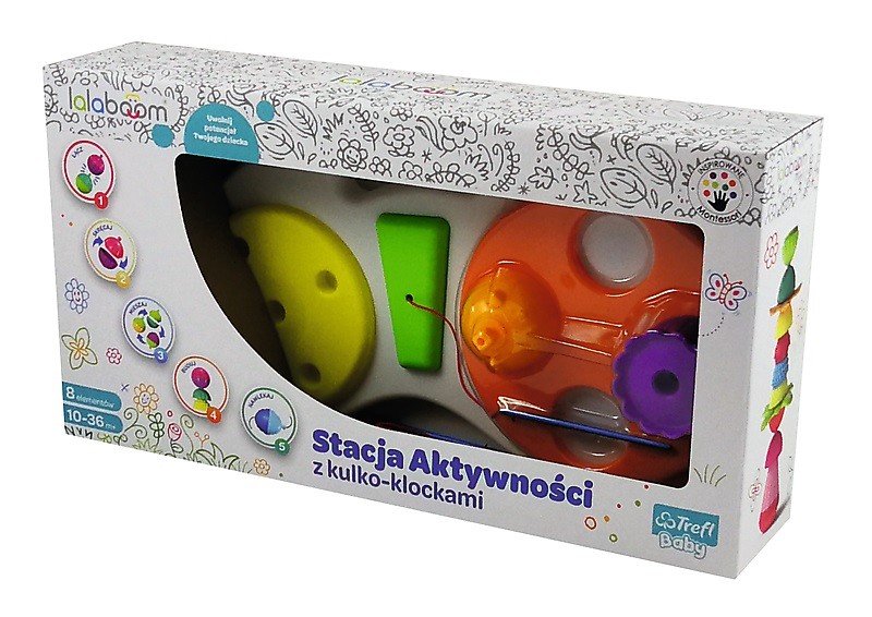 Stacja Aktywności marki Lalaboom dostarcza wiele zróżnicowanych wrażeń dotykowych ze względu na różne faktury poszczególnych elementów. Daje możliwość ćwiczenia ruchów obrotowych nadgarstka. Rozwija chwyt pęsetkowy (przeciwstawienie kciuka palcowi wskazującemu) i precyzyjne ruchy ręki przy nawlekaniu (rozwija małą motorykę i koordynację wzrokowo-ruchową). Część z małymi otworami zachęca do badania otworów palcem wskazującym, co sprzyja rozwijaniu izolowanych ruchów tego palca. To umożliwia z kolei gest wskazania palcem, ważny w komunikacji społecznej (dziecko wskazuje to, co je zaciekawiło lub to, co chce otrzymać).