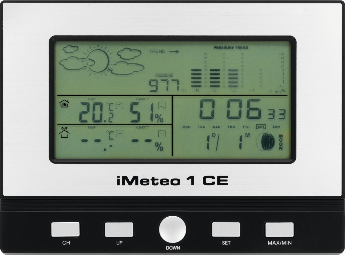 Domowa stacja pogodowa iMeteo 1CE umożliwia precyzyjną ocenę aktualnych oraz prognozowanych warunków atmosferycznych panujących na zewnątrz budynku oraz klimatu w pomieszczeniu. Urządzenie posiada czytelny, podświetlany wyświetlacz o przekątnej 5,6. Temperatura na zewnątrz jest mierzona za pomocą czujnika zewnętrznego iMeteo OS, natomiast klimat w pomieszczeniu jest oceniany za pomocą czujników wbudowanych w stację pogodową. Dodatkowo urządzenie wyświetla aktualny czas i datę.