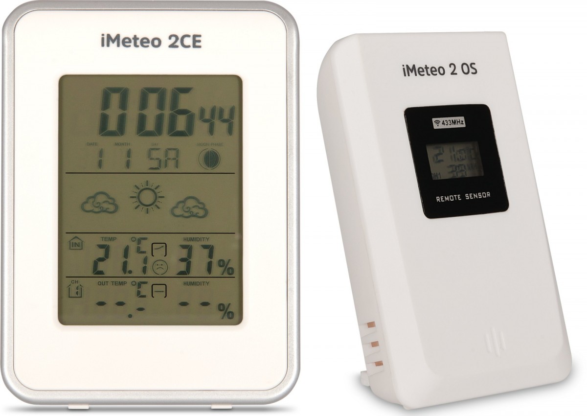 Domowa stacja pogodowa iMeteo 2CE umożliwia precyzyjną ocenę aktualnych warunków atmosferycznych panujących na zewnątrz budynku oraz klimatu w pomieszczeniu. Urządzenie posiada czytelny, podświetlany wyświetlacz LCD. Temperatura i wilgotność na zewnątrz jest mierzona za pomocą czujnika zewnętrznego iMeteo OS, natomiast klimat w pomieszczeniu jest oceniany za pomocą czujników wbudowanych w stację pogodową. Dodatkowo urządzenie wyświetla aktualny czas i datę. Posiada funkcję alarmu, termormetru wewnętrznego i zewnętrznego, wilgotnościomierz, datownik oraz zegar.