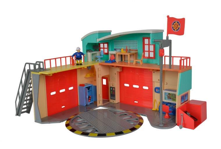Otwierana remiza strażacka z piętrem, obrotową platformą dla pojazdu Jupiter, ze światłem i dźwiękiem, z rurą do zjeżdżania, 2 pary drzwi, figurka Steela, liczne akcesoria. Zestaw nie zawiera wozu strażackiego.