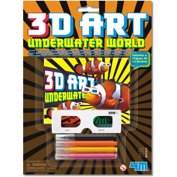 Pokoloruj specjalnymi flamastrami podwodne sceny przedstawiające rozmaite ryby. Spójrz przez okulary 3D i zobacz jak ożywają. Zaskocz swoich znajomych i rodzinę własną trójwymiarową twórczością. To spektakularne doświadczenie optyczne!