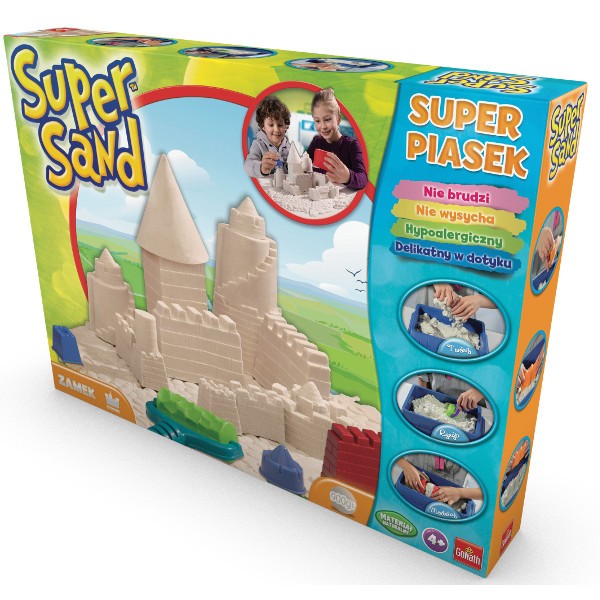 Super aksamitne w dotyku, suche a jednocześnie antybakteryjne i 100% naturalne, takie jest tworzywo Super Sand. Piasek który można używać jeszcze raz i jeszcze raz i jeszcze…Zrób babkę z piasku, albo zamek z fosą. Dołączone narzędzia i piękne foremki pomogą stworzyć czego dusza zapragnie. Masa Super Sands składa się z naturalnych składników mineralnych. Jeżeli coś się rozsypie poza piaskownice nie ma problemu, ponieważ masa ma specjalna strukturę pomagającą w utrzymaniu czystości.Super Sand stymuluje kreatywność dzieci.Daj się ponieść swojej wyobraźni, i ciesz się swoimi kreacjami z Super Sand!Dotknij aby poczuć różnice.Dla dzieci od 4 lat. Opakowanie zawiera 900g masy piaskowej.