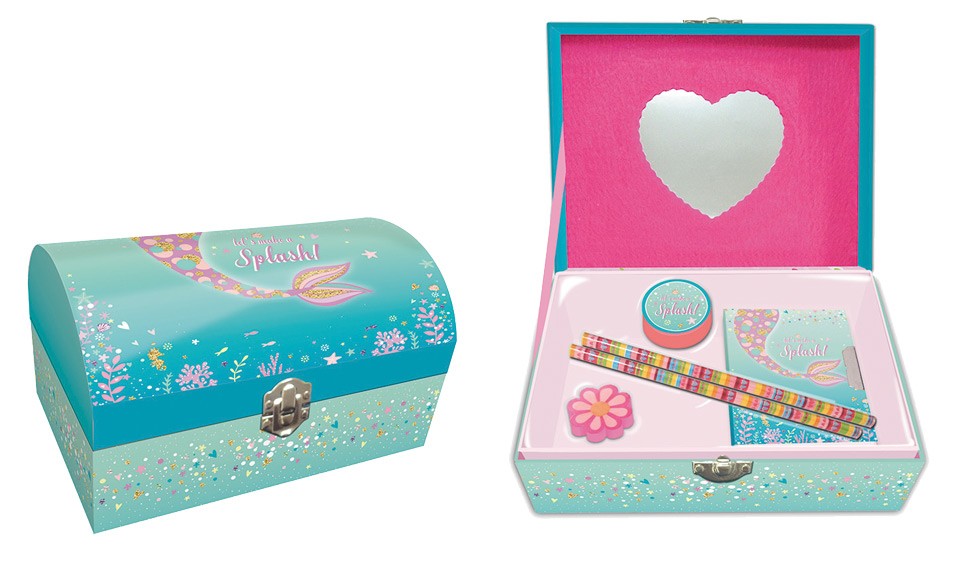 Szkatułka to idealny prezent dla wszystkich dziewczynek lubiących biżuterię i ozdobne drobiazgi. Na zewnątrz ozdobiona jest kolorowymi, błyszczącymi motywami morskimi, co powoduje, że doskonale komponuje się z wystrojem każdego pokoju. Wnętrze szkatułki skrywa lusterko w kształcie serca oraz dodatkowe prezenty: pamiętnik zamykany na kluczyk - 7,5 cm x 11 cm, dwa ołówki, temperówkę oraz gumkę.