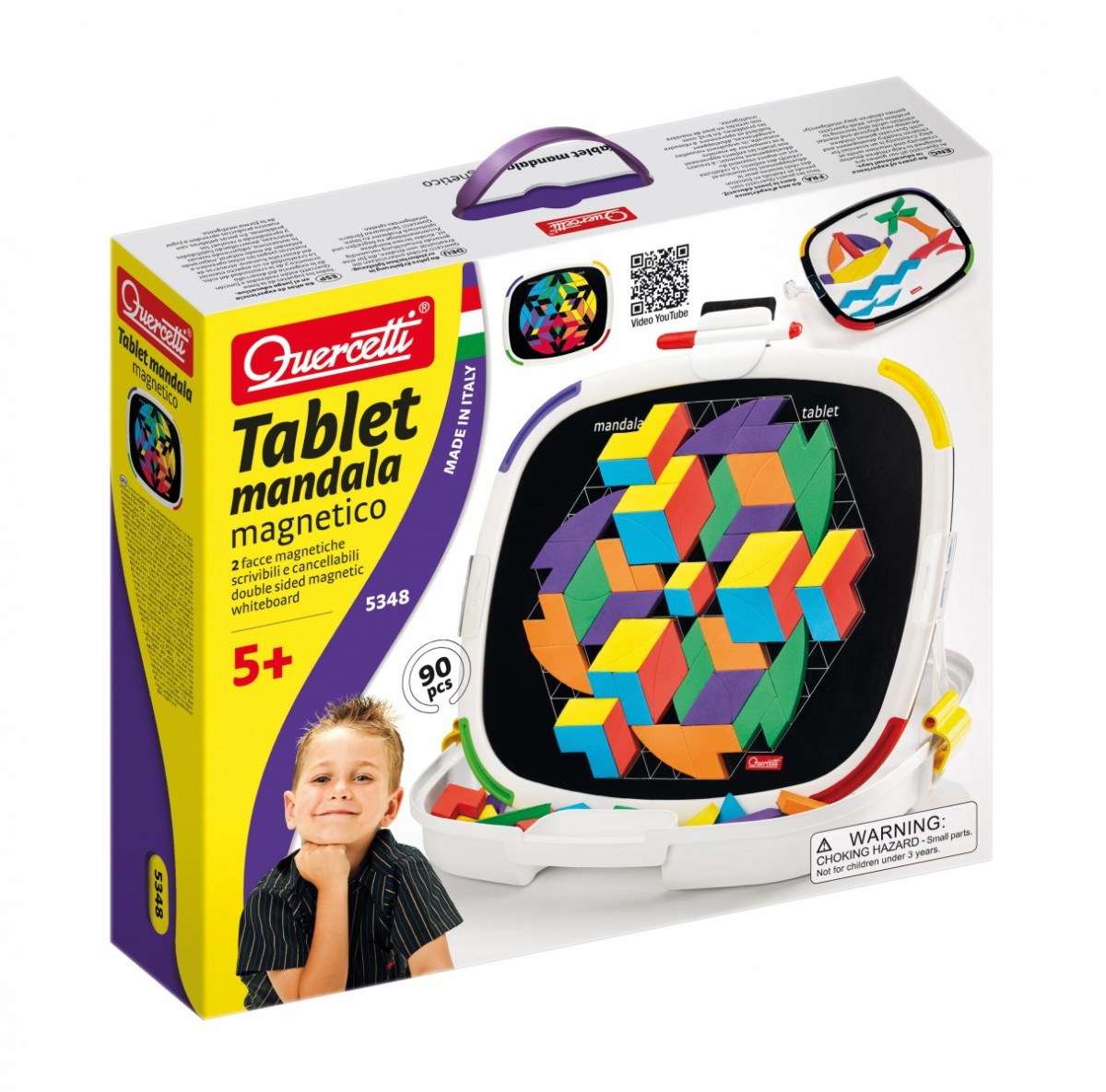 QUERCETTI TABLICA MAGNETYCZNA PREMIUM MANDALA zestaw składa się z 90 magnetycznych płytek mozaikowych o różnych kształtach, za pomocą których można tworzyć piękne mandale. Wystarczy do tablicy magnetycznej w miejsce siatki przyłożyć wybrany kształt według wzoru lub wyobraźni. Po zabawie magnesy można schować do walizeczki, której wieczko stanowi magnetyczna tablica, na której poza układaniem można rysować specjalnym mazakiem dołączonym do zestawu.