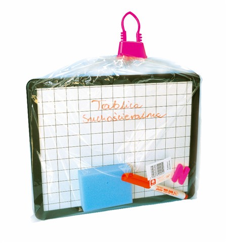 Dwustronna tablica do rysowania i pisania wraz z mazakiem i gąbką o wymiarach 33/23 cm.