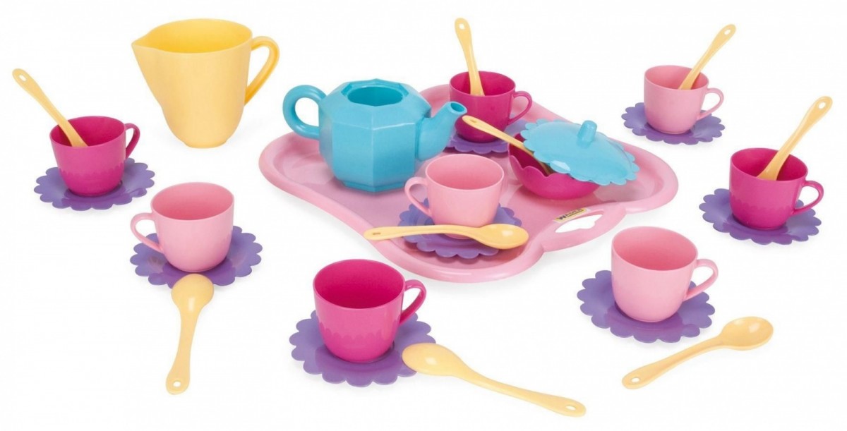 Zestaw składa się z 30 elementów: tacy z uchwytem, 8 talerzyków, 8 filiżanek, dwóch dzbanuszków, cukierniczki z pokrywką oraz 9 łyżeczek. Twoje dziecko będzie teraz mogło zaprosić koleżanki na herbatę albo organizować przyjęcie urodzinowe dla lalek.