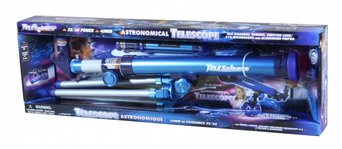 Zestaw zawiera teleskop astronomiczny z aluminiowym statywem z możliwością 25 i 50x krotnego powiększenia (40 mm). To znakomita zabawka dla dzieci ciekawych świata. Teleskop posiada okular z możliwością obserwowania ciał niebieskich od góry oraz dodatkową lunetę.