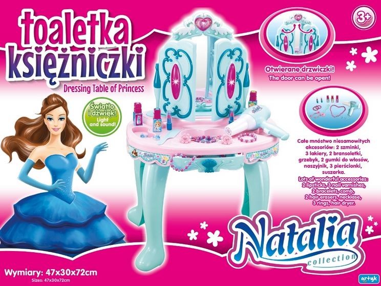 Inne akcesoria zawarte w zestawie: grzebyk, 3 atrapy lakierów, 2 atrapy szminek, 3 pierścionki, 2 bransoletki, 2 gumki,naszyjnik i suszarka, która naprawdę działa (zasilana 2xAA baterie niedołączone do zestawu).