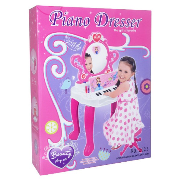 Toaletka na baterie z ukrytą klawiaturą pianina i pełnym zestawem akcesoriów niezbędnych do utrzymania codziennej stylizacji. Duże lustro zwieńczone świecącym serduszkiem. W zestawie taboret. Klawisze wydobywają dźwięki realistycznie naśladujące prawdziwy instrument.