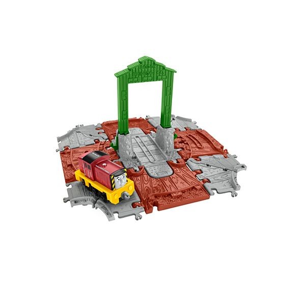 Zestaw startowy w formie poręcznego, przenośnego sześcianu. Wystarczy nacisnąć uchwyt u góry, a zestaw automatycznie się rozłoży w tor w kształcie pętli! Aby z powrotem złożyć zestaw, podnieś panele i zamocuj je do zatrzasków z boku uchwytu. Możesz też otworzyć drzwi i „przejechać” przez stację w zestawie, nawet gdy ten jest złożony. Dzięki uchwytowi możesz zabrać przenośną stacyjkę ze sobą! Każdy z zestawów zawiera jedną lokomotywkę. Lokomotywka przechowywana jest wewnątrz zestawu.