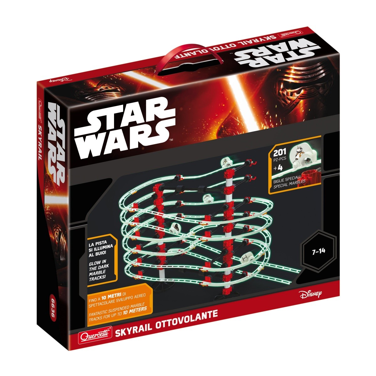 QUERCETTI TOR KULKOWY SKYRAIL OTTOVOLANTE STAR WARS - Ten zestaw składa się z 201 giętkich i niełamliwych części jak tory, cięgna, kołowrotki, łączniki oraz 4 pojazdów na licencji STAR WARS pełniących funkcję kulek. Tor wykonany jest z materiału fluoroscencyjnego, przez co wzmacnia efekt zabawy z ciemnym pokoju przenosząc nas w świat gwiezdnego wyścigu. W zabawie można odwzorowywać modele zamieszczone na instrukcji lub eksperymentować i budować własne konstrukcje.