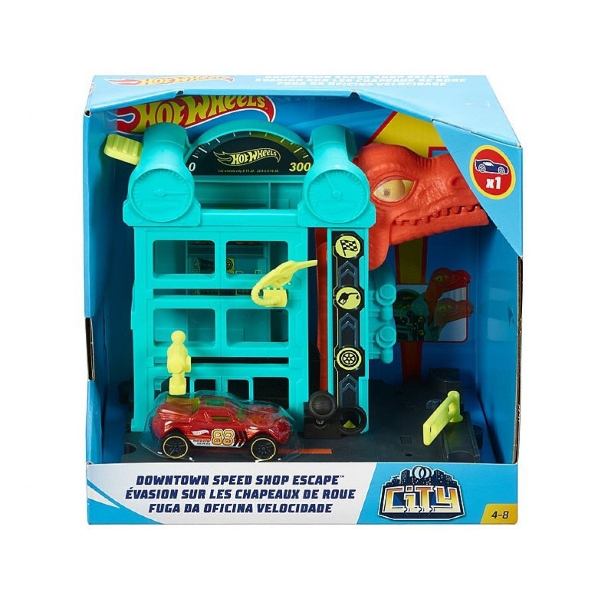 Dzieci mogą odkrywać Hot Wheels City, odwiedzając kultowe miejsca samochodami z linii Hot Wheels. Zamknij bandytów na posterunku policji, zjedź po rurze w remizie strażackiej, zatankuj paliwo na stacji benzynowej, złap złośliwą małpę w elektrowni i umykaj przed piraniami w akwarium. Zestawy można łączyć bezpośrednio z innymi zestawami Hot Wheels za pomocą nowego systemu łączenia, który jest kompatybilny z pomarańczowym torem. Zestaw zawiera jeden pojazd Hot Wheels. Sprzedawane oddzielnie.