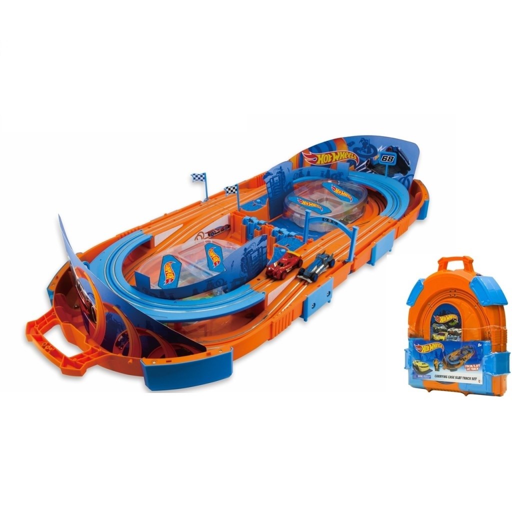 Tor wykonany w skali 1:64, długość trasy po rozłożeniu 173 cm. Całość zapakowana jest w plastikową walizkę, która po rozłożeniu zamienia się w tor. W zestawie znajdują się 2 kontrolery z funkcją doładowania, 2 autka oraz elementy dekoracyjne toru. Całość na licencji Hot Wheels nadającemu tej zabawce niepowtarzalny charakter.