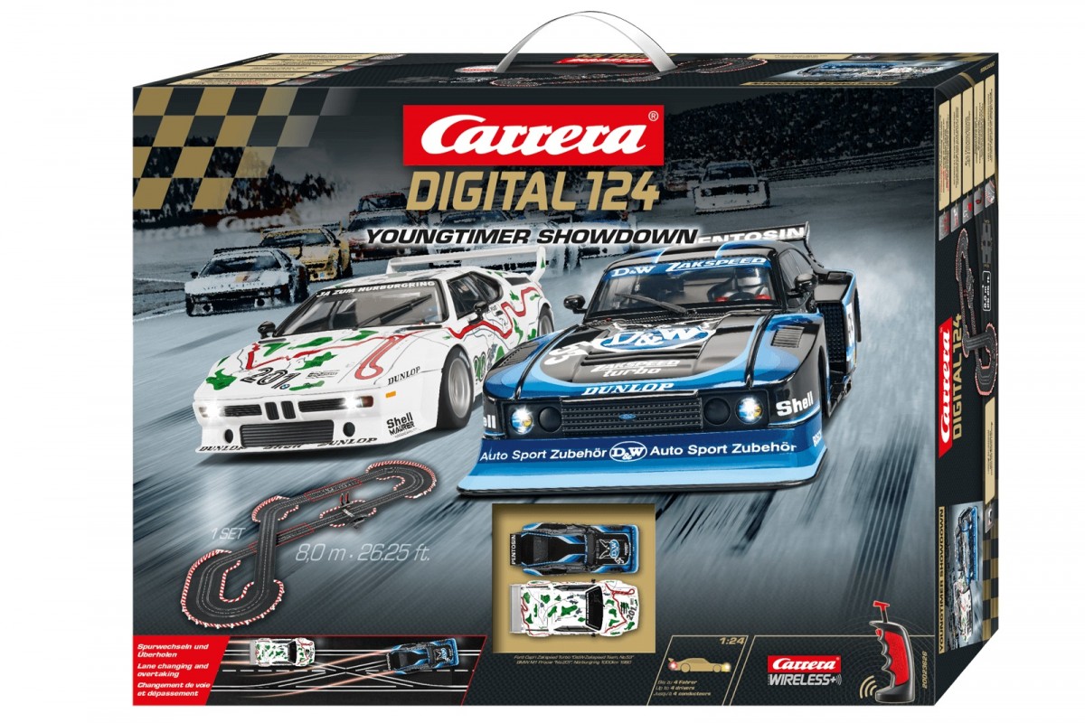Dwie ikony niemieckiego sportu motorowego z kierowcami wyścigowymi znajdują się w Carrera Digital 124 na linii startu "Youngtimer Showdown". BMW M1 Procar napędzany przez Hansa Joachima Stuck w wystroju toru Nürburgring przeciwko Fordowi Capri Zakspeed Klausa Niedźwiedzia, sponsorowanego przez legendę tunera D & W. Prawie żadna era nie zapadła na tak długo w pamięć fanów jak lata osiemdziesiąte. Wspomnienia te można odświeżyć na 8-metrowym torze Carrera.