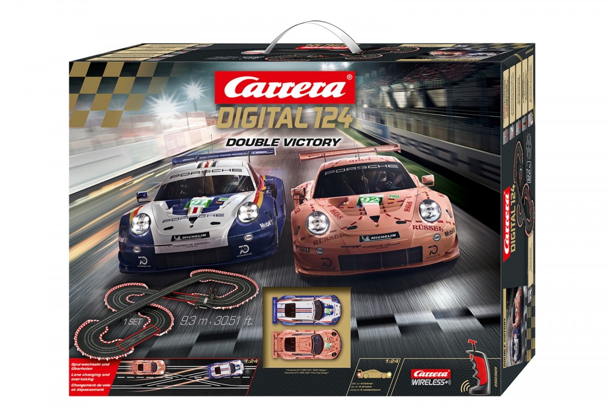 Zestaw Tor wyścigowy Double Victory o długości 9,3 m posiada urządzenia w technologii Wireless + 2,4 GHz oraz dwa samochody: Porsche 911 RSR #91 '956 Design' and Porsche 911 RSR #92 'Pink Pig Design' . Po złożeniu zestaw posiada wymiary 255 cm x 309 cm.