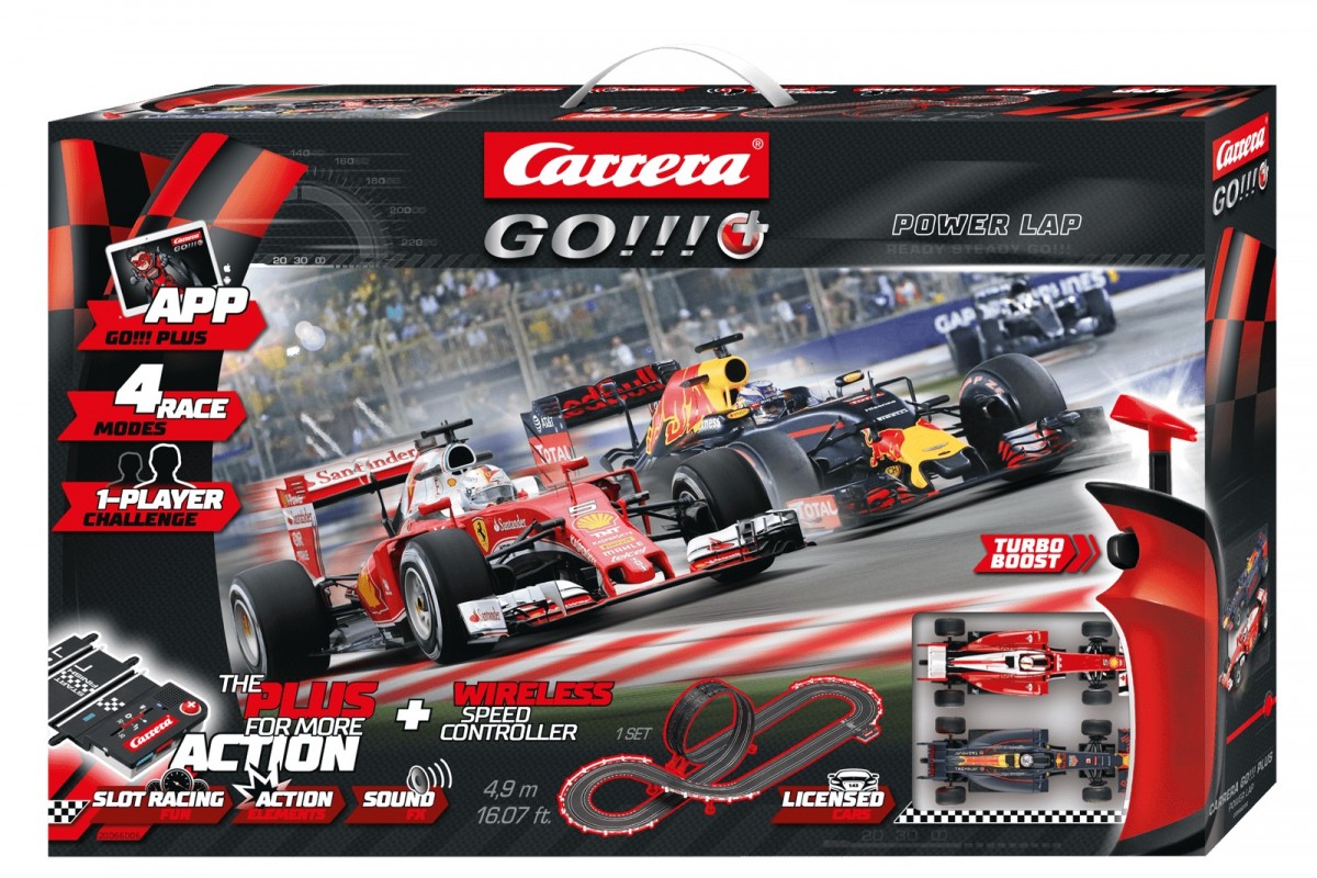 W nowym zestawie Power Lap przeznaczonym dla Carrera GO!!! Plus muszą utrzymać się dwa najlepsze bolidy królewskiej klasy Formuły 1. Tor o długości 4,9 metra z pętlami i prostymi zaprasza do ekscytujących manewrów, kiedy czterokrotny mistrza świata Sebastian Vettel w Ferrari SF16-H zajmuje miejsce na mecie obok swojego konkurenta Daniela Riccardo w Red Bull Racing TAG Heuer RB12. Czy Red Bull Design doda skrzydeł młodemu Australijczykowi i doprowadzi go do celu jako zwycięzcę, czy też mistrz świata Vettel i tym razem utrzyma się na nogach? O tym zdecydują piloci Carrera siedzący przy drążku!