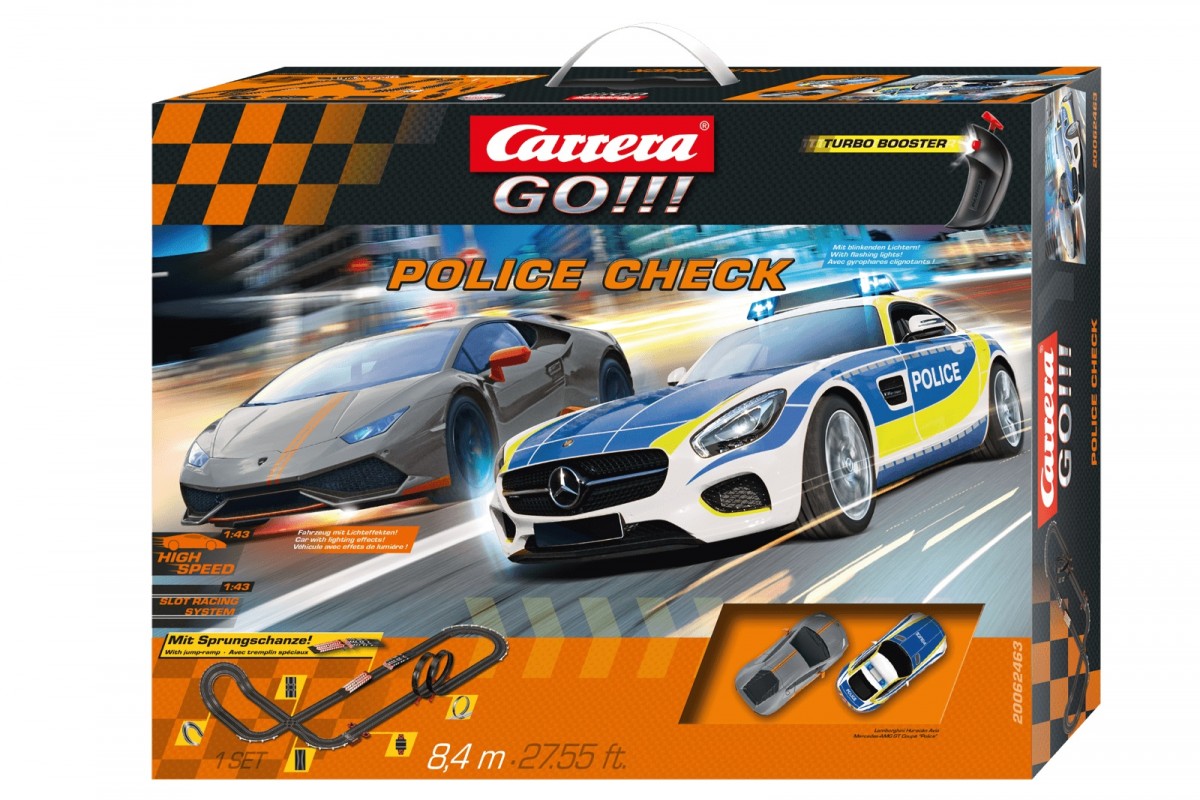 Policja, zawsze przyjazna i pomocna, jest gotowa do akcji w nowym zestwie Carrera GO!!! Kontrola policyjna! Mercedesem AMG GT Coupé Polizei policjanci jadą za Lamborghini Huracán LP 610 4 Avio na torze wyścigowym Carrera o łącznej długości 8,4 metra. Policjanci muszą nieźle dodawać gazu, bo włoski sportowy samochód z silnikiem V10 w mgnieniu oka uzyskuje maksymalną prędkość 325 km/h. Ale mając pod maską 557 KM, Mercedes ma wszelkie warunki, aby złapać kierowcę, który przekroczył prędkość!