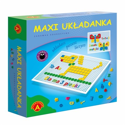 Maxi Układanka to zabawka i świetna pomoc dydaktyczna dla dzieci, które zaczynają naukę czytania i liczenia. Zabawka składa się z perforowanej tablic, zbioru dużych i małych liter oraz z zestawu cyferek. W skład zabawki wchodzą również różnokolorowe elementy, z których można tworzyć obrazki, układając je techniką mozaiki. Literki i cyferki można wpinać w otwory tablicy, układając w ten sposób wyrazy, zdania i proste działania matematyczne. Tworzenie obrazów rozwija wyobraźnie i plastyczną wrażliwość. Zabawa "Maxi Układanką" jest również świetną okazją by ćwiczyć cierpliwość i zręczność manualną.