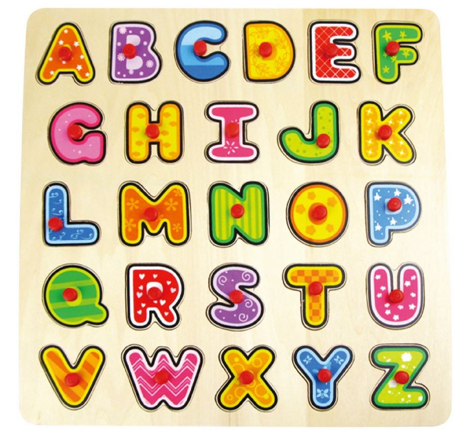 - Zabawka zawiera 26 elementów z pinezkami przedstawiające alfabet w wersji dużych liter.