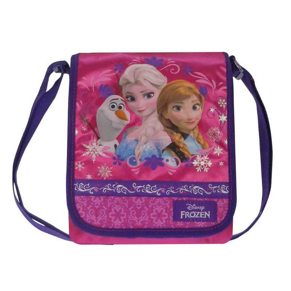 Torebka listonoszka Kraina Lodu Frozen renomowanej, holenderskiej firmy Vadobag. Wspaniałe kolory, wysoka jakość produktu. Główna kieszeń zamykana na rzep oraz dodatkowo na metalową napę. Wewnątrz kieszeni głównej kieszeń o wymiarach ok. 17x14cm (szer.x wys.) zamykana na zamek oraz kieszonka na ok. 8x10cm (np. na komórkę). Regulowana długość paska. Całość przepięknie wykonana i w ślicznych kolorach. Idealna dla młodej wielbicielki Frozen.