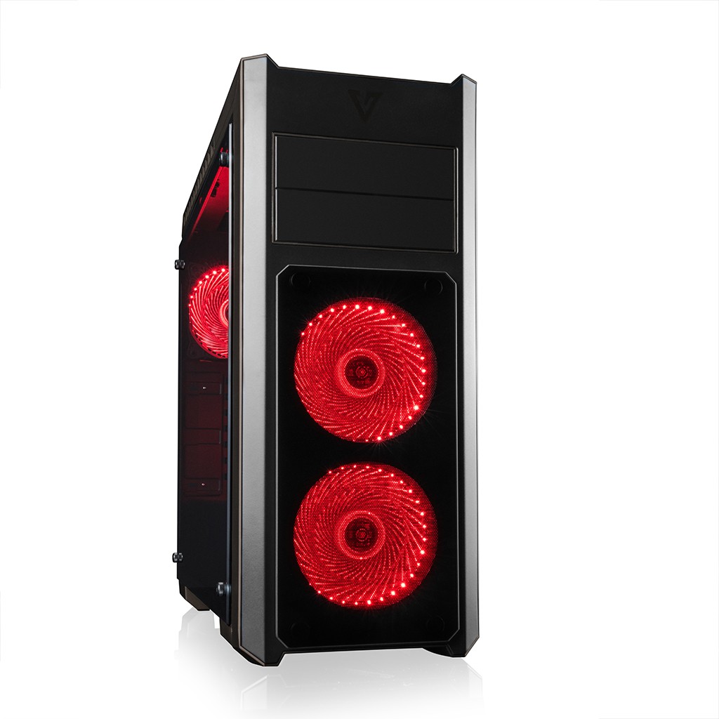 Obudowa VOLCANO CERES posiada fabrycznie zamontowane trzy podświetlane w czerwonym kolorze wentylatory chłodzące LED o średnicy 120 mm (jeden tył i dwa przód), co przy braku komponentów blokujących przepływ powietrza zapewnia doskonałe chłodzenie wnętrza. Maksymalna wysokość dostępna dla układu chłodzenia procesora to 163 mm.