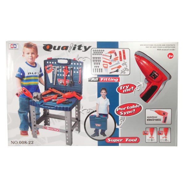 Niezbędnik małego majsterkowicza. Warsztat można w każdej chwili łatwo złożyć do walizki i zmienić miejsce zabawy. W zestawie znajdują się podstawowe narzędzia, takie jak piła, imadło, klucz, obcążki śrubki itp.