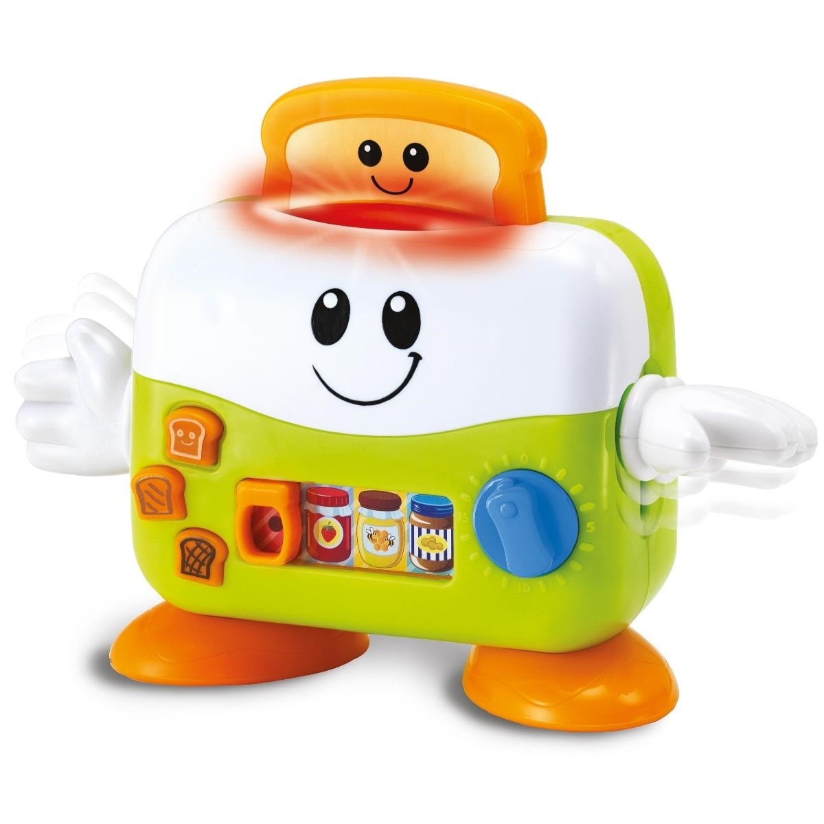 - W zestawie znajduje się uśmiechnięty toster z ruchomymi rączkami po bokach.