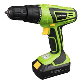 Pracując z wiertarką akumulatorową Fieldmann możesz dotrzeć do każdego miejsca, ponieważ nie będzie cię ograniczała długość kabla - urządzenie działa dzięki baterii litowo-jonowej 14,4 V. Wiertarka razem z baterią ma niewielką wagę i jest dobrze wyważona. Wyposażona jest również w wygodną, ergonomiczną rękojeść. Wiertarka posiada szybko zaciskający się uchwyt o szerokości do 10 mm, 2 prędkości oraz 25+1 poziomów momentu obrotowego, które będą przydatne podczas wkręcania i dokręcania różnego rodzaju śrub i wkrętaków.