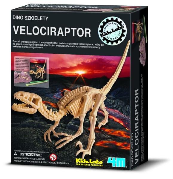 Zestaw zawiera bryłę gipsu w której ukryte są kości dinozaura oraz narzędzia do prowadzenia wykopalisk. Po odnalezieniu i oczyszczeniu wszystkich kości można z nich złożyć cały szkielet. Gotowy szkielet ma około 21 centymetrów długości. Dołączona do zestawu kartonowa karta ekspozycyjna zawiera wiele ciekawych informacji na temat Velociraptora na odwrocie.