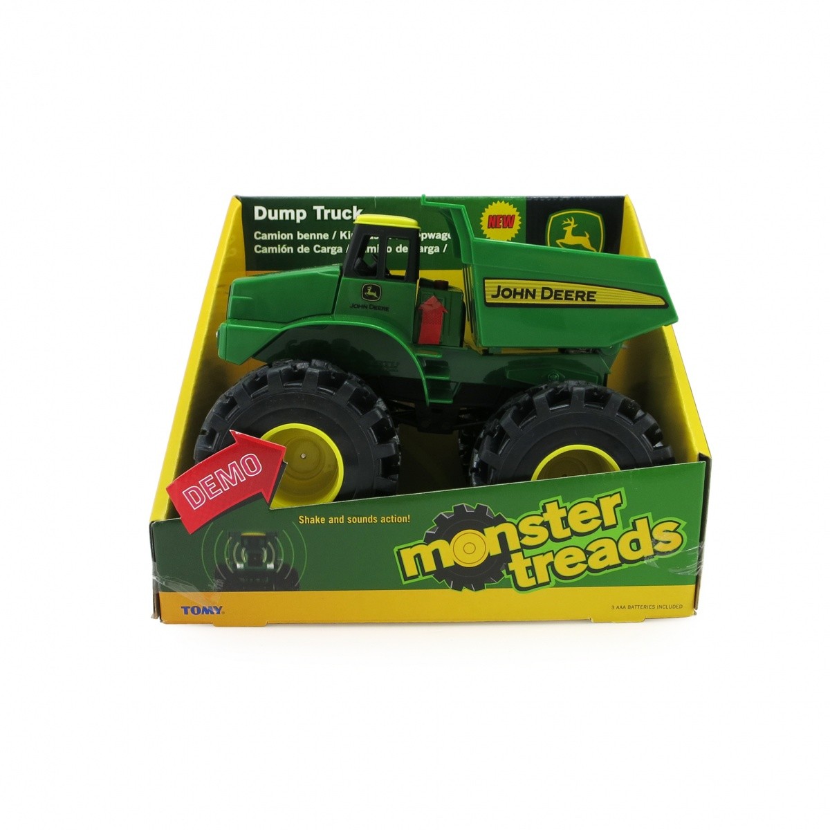 Wywrotka John Deere Monster z ogromnymi kołami. Bieżnik wykonany jest z miękkiej gumy, wywrotka wydaje odgłos pracującego silnika oraz oscyluje jak prawdziwy traktor Monster. Opakowanie z funkcją DEMO.
