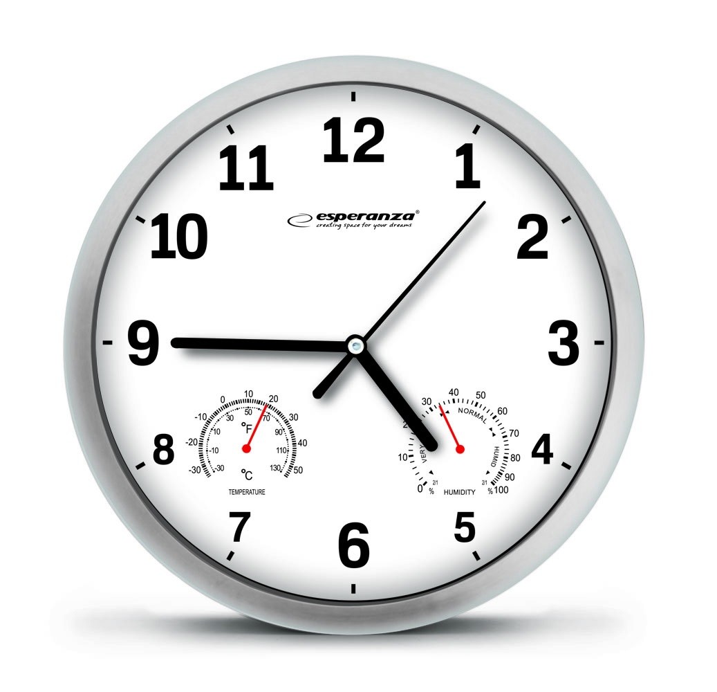 Nasz zegar ścienny Esperanza LYON służy nie tylko do pokazywania czasu - można na nim odczytać też temperature oraz wilgotność otoczenia. Jego wzornictwo sprawia, iż udekorujesz nim każde mieszkanie, biuro, sklep czy restaurację.