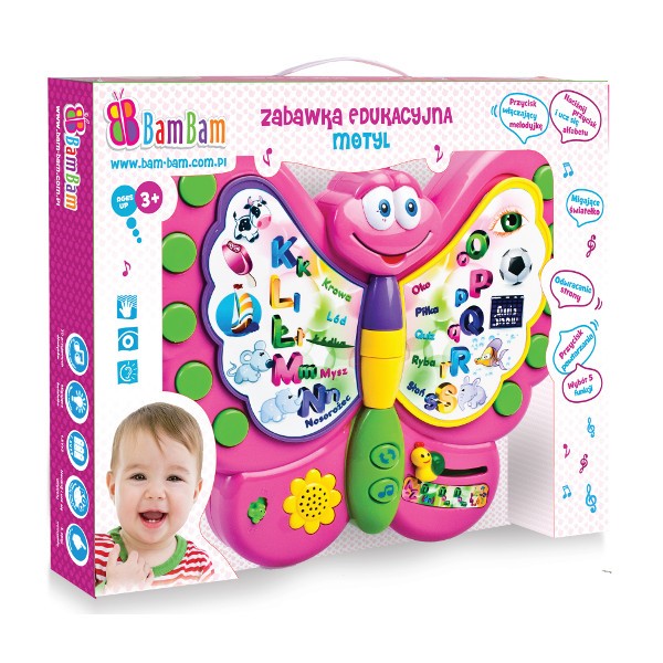 Muzyczny Motyl zabawka edukacyjna od 36 mca. Kolorowy motyl, z przekładanymi kartami pozwala na zmianę dźwięków liter bądź głosek wygrywanych na odpowiednich klawiszach, w zależności od rysunku na karcie. Dodatkowo przesuwanie suwaka pozwala na wybór opcji wygrywania liter, głosek, wymowy, lub całych wyrazów. Migoczące przyciski dodatkowo uatrakcyjniają zabawę. Zabawka stymuluje rozwój zmysłu słuchu, wzroku oraz rozwija zdolności manualne. Uczy literek, głosek oraz pełnych nazw przedmiotów, zwierząt bądź roślin.