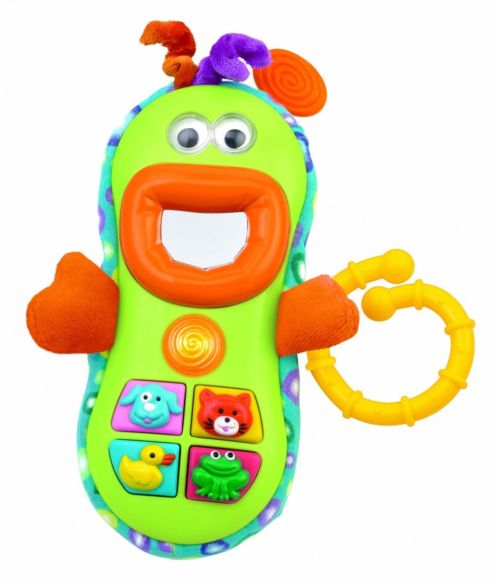 Zabawny telefon zaciekawi Twoje dziecko wieloma wesołymi funkcjami. Zabawka o żywych, radosnych kolorach najbardziej spodoba się najmłodszym dzieciom. Jej korpus obszyty jest mięciutkim materiałem, telefonik posiada miękkie łapki - poduszki oraz niesforne materiałowe loczki. Na samym środku umiejscowione jest lusterko z bajkową klawiaturą. Specjalny uchwyt pozwala zawiesić zabawkę na łóżeczku lub wózku . Twój maluszek z pewnością pokocha ten mały gadżet.