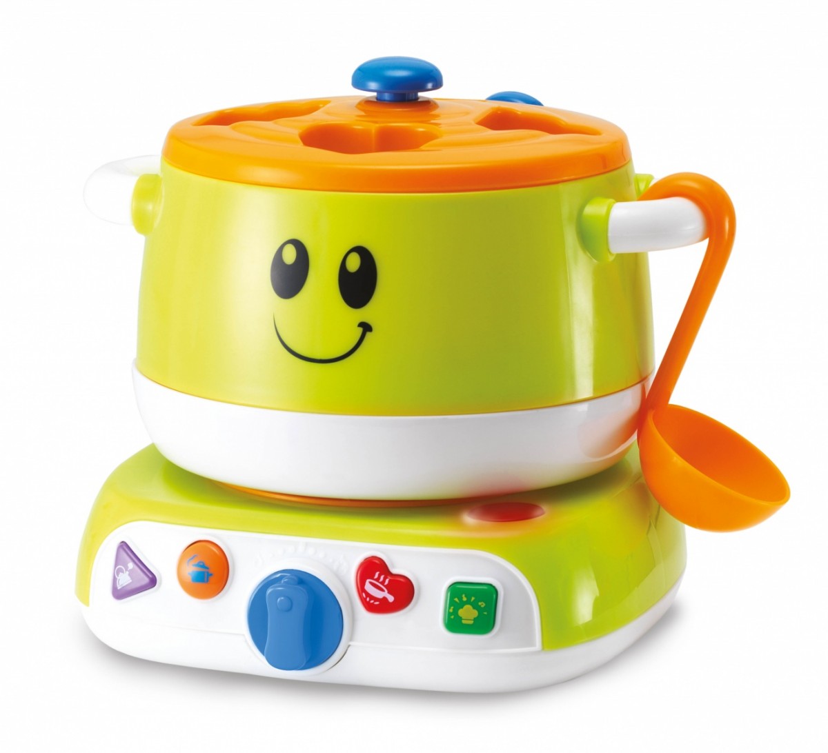 Zestaw zawiera uśmiechnięty garnek oraz patelnię. Zabawka pełni również funkcję sortera. W pokrywce są umieszczone otwory, przez które dziecko wrzuca odpowiednie klocki. Atrakcyjny wygląd, kolory, dźwięki, wszystko to inspiruje do zabawy i zachęca dziecko do samodzielnego działania.