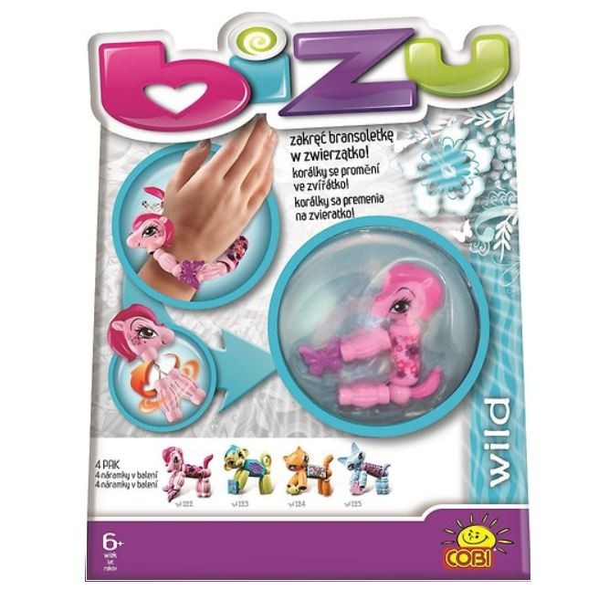4 Pack Bizu - zestaw zawiera wszystko, co jest potrzebne do wykonania czterech bransoletek BIZU lub zestawu składającego sie z bransoletki i naszyjnika. Bransoletkę można tak zakręcić, aby powstało zwierzątko. Kolekcja podzielona jest na 4 modne style: Glam, Wild, Funky i Rock. Tworzenie bransoletki jest bardzo proste. Wystarczy zaczepić elastyczną linkę do narzędzia do nawlekania, które ułatwia wykonanie bransoletki. Następnie nawlekamy koraliki zaczynając od ogonka, dwie tylne łapki, tułw, jedną łapkę, ozdobę, drugą przednią łapkę i na końcu główkę. Zdejmujemy linkę z koralikami. Teraz bransoletkę można założyć na rękę i zapiąć, lub zwinąć tak, jak się tworzy zwierzątka z balonów. Powstanie zwierzątko, które trzyma w łapkach ozdobę. Dziewczynki mogą wymieniać ozdoby w bransoletkach, a także mieszać koraliki z innych zestawów tworząc własne, unikalne wzory.