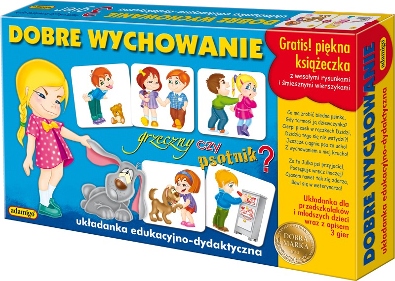 Podczas zabawy dzieci zapoznają się z przykładami zarówno dobrego jak i złego zachowania, dzięki czemu nauczą się je rozróżniać. Oprócz gry w zestawie znajdziesz także książeczkę, w której na 32 stronach przeczytasz piękne wierszyki. Układanka „Dobre wychowanie” posiada nie tylko walory dydaktyczno edukacyjne, ale również dzięki trzem rodzajom gier jakie proponuje, ćwiczy pamięć, rozwija koncentrację i równocześnie stymuluje do myślenia.