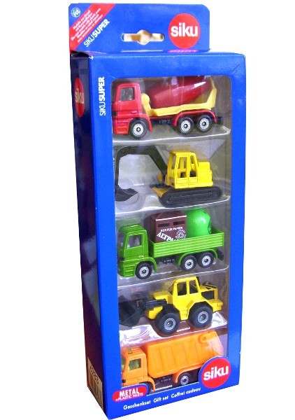 Zestaw 5 pojazdów specjalnych SIKU, w którego skład wchodzą: betoniarka, koparka, traktor z ładowarką, śmieciarka i ciężarówka. Doskonały pomysł na prezent dla dziecka lub uzupełnienie kolekcji modeli SIKU.