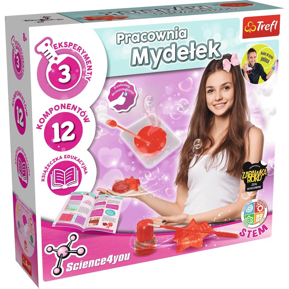 Z Pracownią Mydełek od Science4you przygotuj pachnące mydełka w kształcie gwiazdy lub róży, a później użyj ich podczas kąpieli albo podaruj w prezencie. Wykonane łasnoręcznie mydła są niepowtarzalne. Z dołączonej do zestawu książeczki edukacyjnej dowiedz się, jakie jest pochodzenie mydła i jak się je wytwarza.