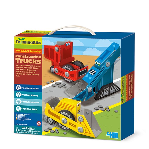 Ciężarówki budowlane. Łatwy montaż: bez kleju, śrub i taśmy! Solidna konstrukcja! Odkryj proste maszyny i dźwignię podczas zabawy. Bez baterii i odpadów! Pokaż swoją pracę, aby zadziwić swoją rodzinę i przyjaciół!