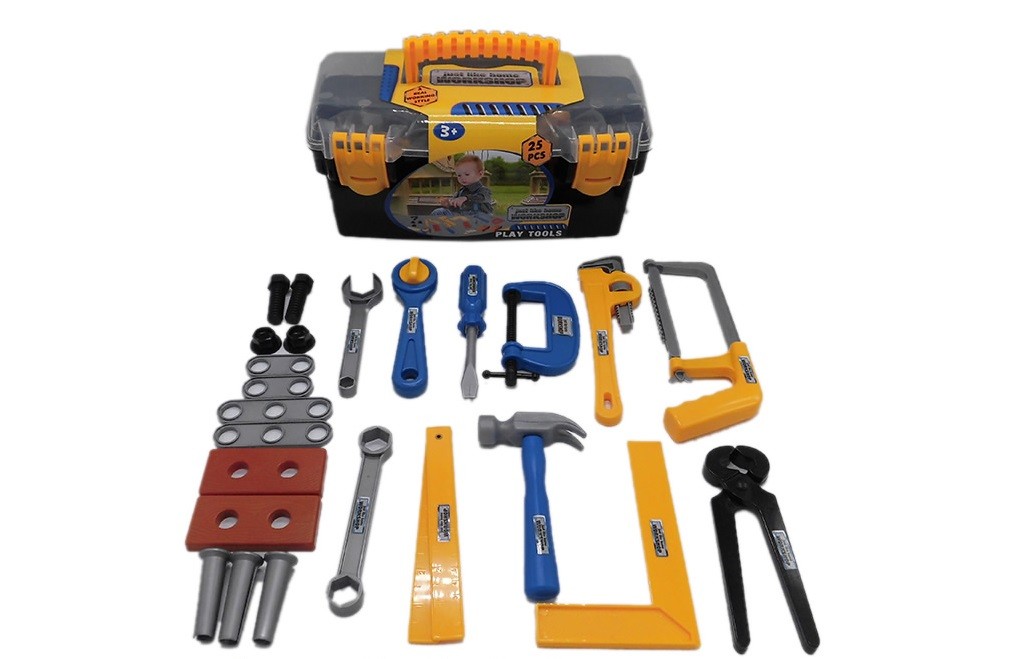 W skład zestawu wchodzą: piła do drewna, miara, okulary ochronne, klucz francuski, młotek oraz 15 innych narzędzi i akcesoriów.