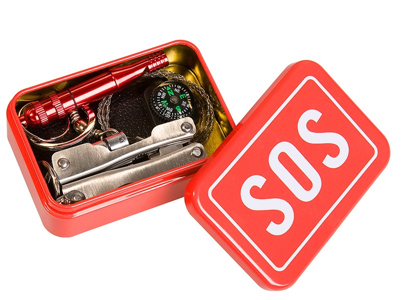 Zestaw survivalowca w praktycznym pudełku SOS, znajdziesz w nim wiele przydatnych narzędzi/przedmiotów, które pomogą Ci przetrwać na łonie natury.