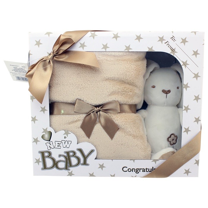Zestaw Karmelowy New Baby to prześliczny prezent dla nowo narodzonego maluszka, królik - przytulanka oraz kocyk są wykonane z wyjątkowo mięciutkiego i milutkiego w dotyku materiału a do tego całość jest zapakowana w eleganckie pudełko.