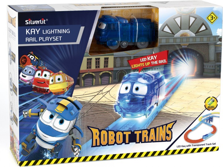 Zestaw transparentnych, wielokolorowych torów ze święcącym pojazdem Kay. Kay jadąc po torach podświetla je.