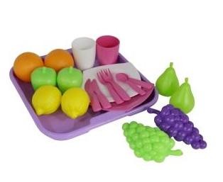 W jego skład wchodzą owoce: jabłka, gruszki, cytryny, pomarańcze, winogrono. Oprócz tego zestaw zawiera dwa kubki, dwa talerzyki i dwa komplety sztućców. Wszystko to podane jest na dużej tacy.