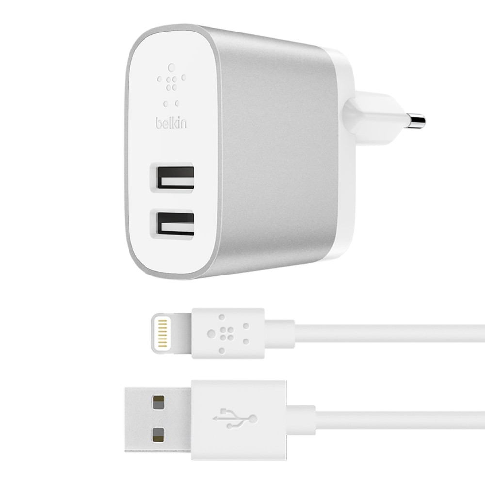 Ładowarka sieciowa 2xUSB-A 2x12W kabel czarny USB-A Lightning 1,2m srebrna